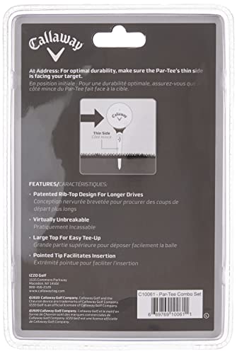 Details: The Callaway par-tee performance tees combo pack includes 4 large 3 1/4" tee for the driver and 2 smaller 1 3/4" tees for irons and hybrids. The par-tee features a co-molded construction with a durable plastic base and rubber Cupped top. The Cupped top helps deliver a low spin launch for added distance. The sharpened tip makes for easy insertion and can double as a divot repair tool. Virtually unbreakable, a single tee can last many rounds if not the entire season.