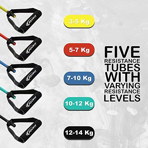 - Five Resistance Bands Levels : [Yellow - 3-5 Kg ] [Red - 5-7 Kg] [Blue - 7-10 Kg] [Green - 10-12 ] [Black- 12-14 ], All of 4 Foot Length.