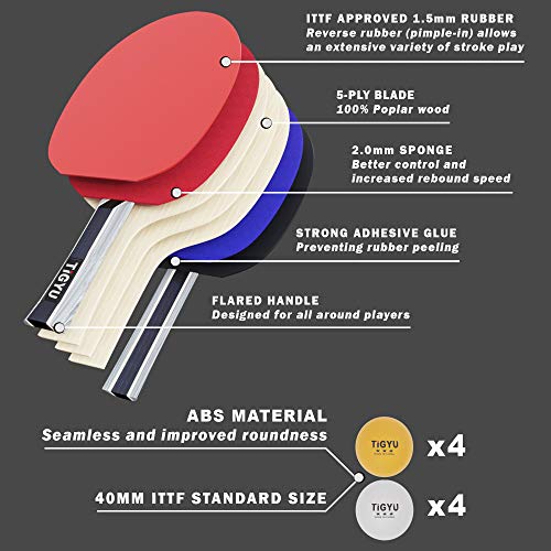Tigyu Ping Pong Paddle Set of 4 - Table Tennis Paddles - Ping Pong Net for Any Table - Table Tennis Balls - 4 Over Grips - Storage Case